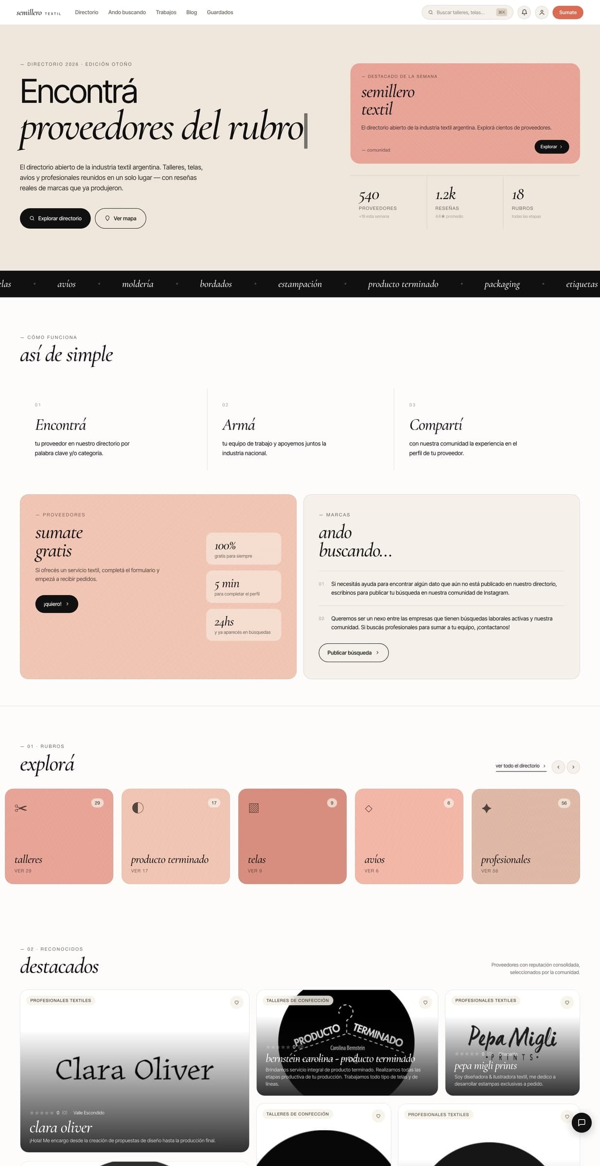 Un estudio creativo, de punta a punta. Estrategia, dirección de arte, interacción, motion, full stack. Construido en WordPress (WooCommerce cuando hace falta tienda) o en el stack moderno detrás de Rifalo, Noriu y Semillero Textil (React, Next.js, Supabase). Diseñado en el navegador, todo lo hacemos nosotros.